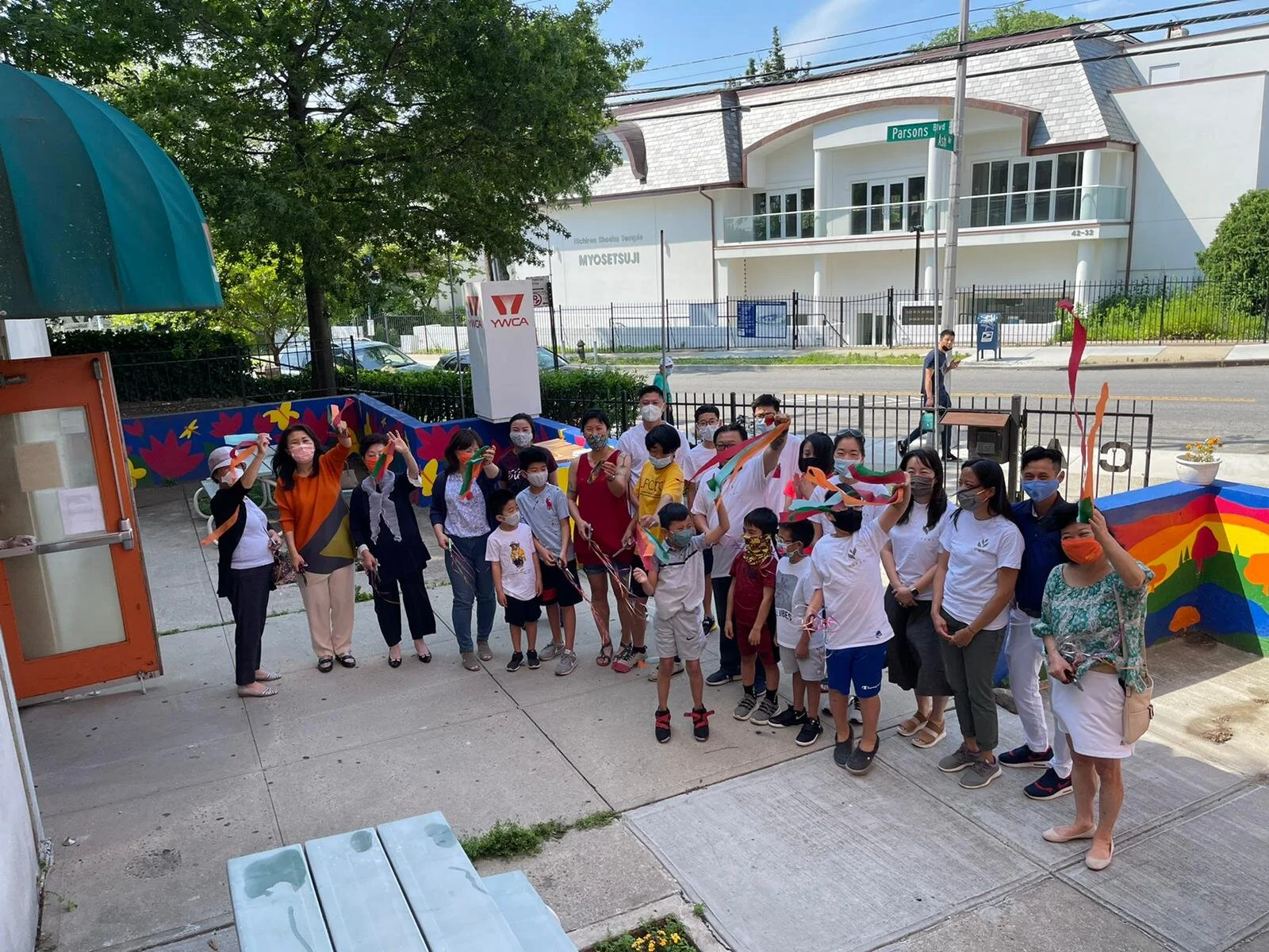 Many thanks to Andrea Ng and to our multitude of volunteers who stopped by on Saturdays to help complete the mural. If you’re driving by Parsons Boulevard, you can’t miss it!